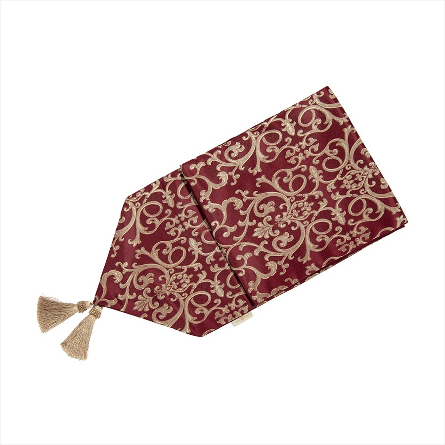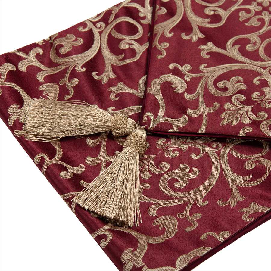 イタリアの伝統的なアラベスク模様を施した深い赤の布地を使い、クラシックで落ち着いた仕上がりが印象的です。 人気の秘密は女性の心を擽るタッセルを使いエレガントなデザインと実用性を兼ね備えた商品にあります。 テーブルやコンソール、玄関のシューズBOXの上などにこれを1枚敷くだけでとても高級感がでます。又ベットメイクに使ってもお洒落です。 同じ生地の小物入れクッションもございます。 |