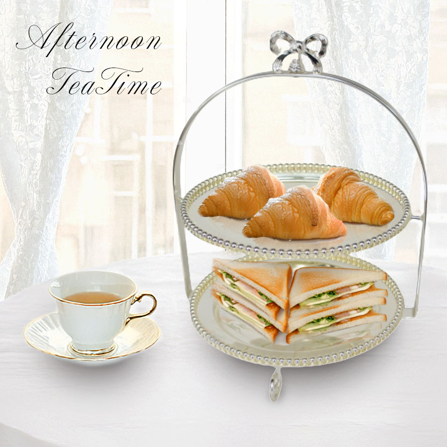 かわいいリボンがアクセント。格調高いシルバー色の2段ケーキスタンドです。 優雅なティータイムを一層華やかに演出してくれます。 25cmの大きなお皿は取り外し可能で実用的です。 ケーキやお菓子、フルーツはもちろん、アクセサリーや小物のディスプレイにも最適です。 |