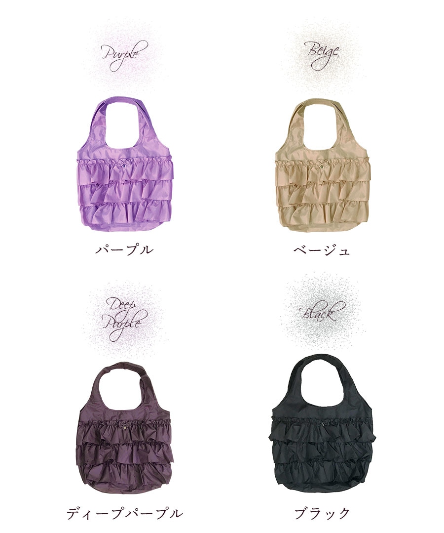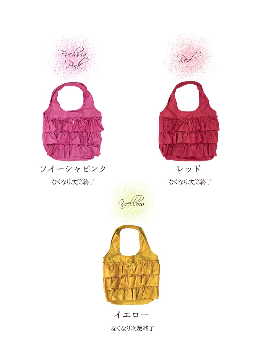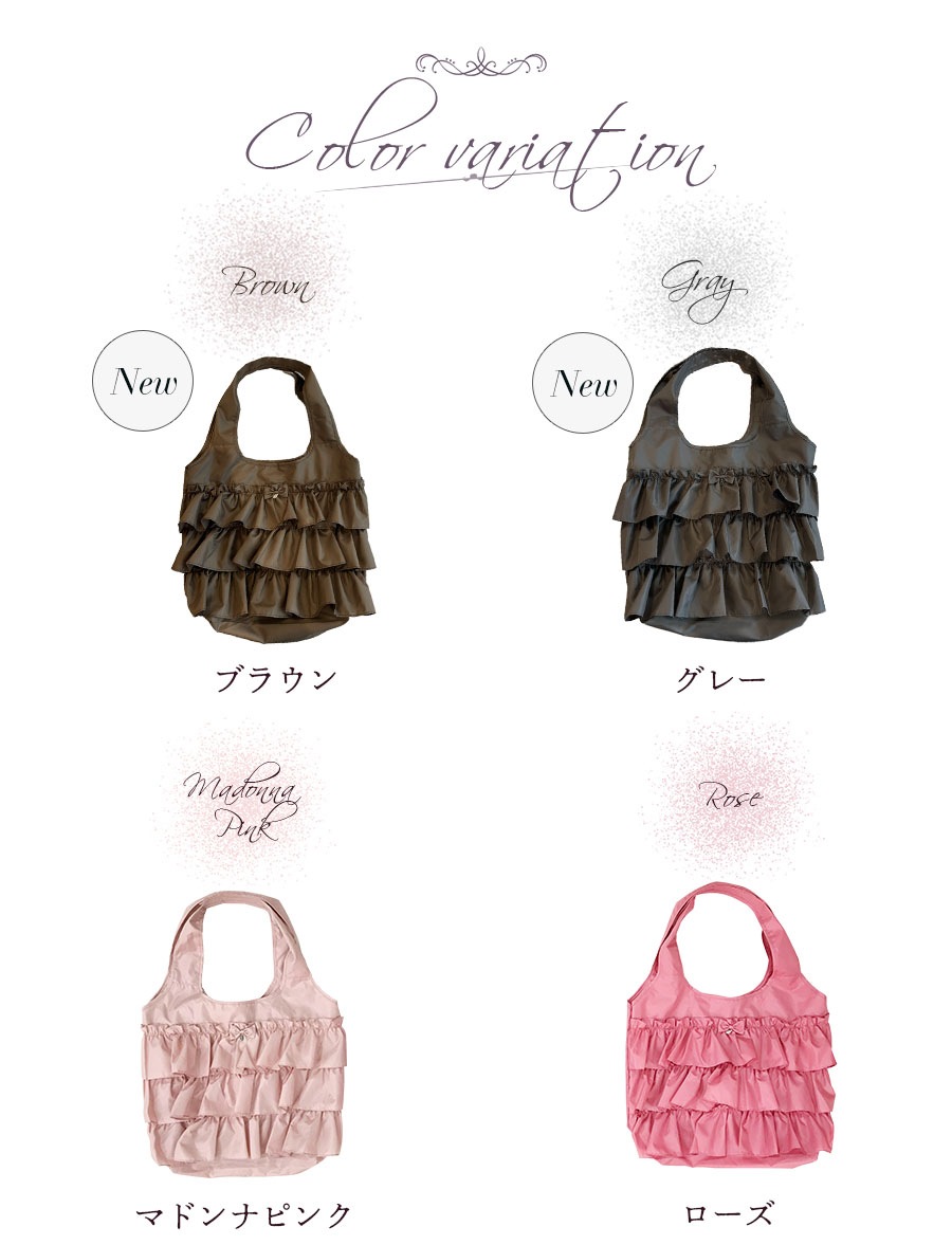 | 商品説明 | 大人気のフリルバッグシリーズ Lサイズがリニューアルしました。 3段になったフリルの幅を大きくして更に可愛くなりました。 |