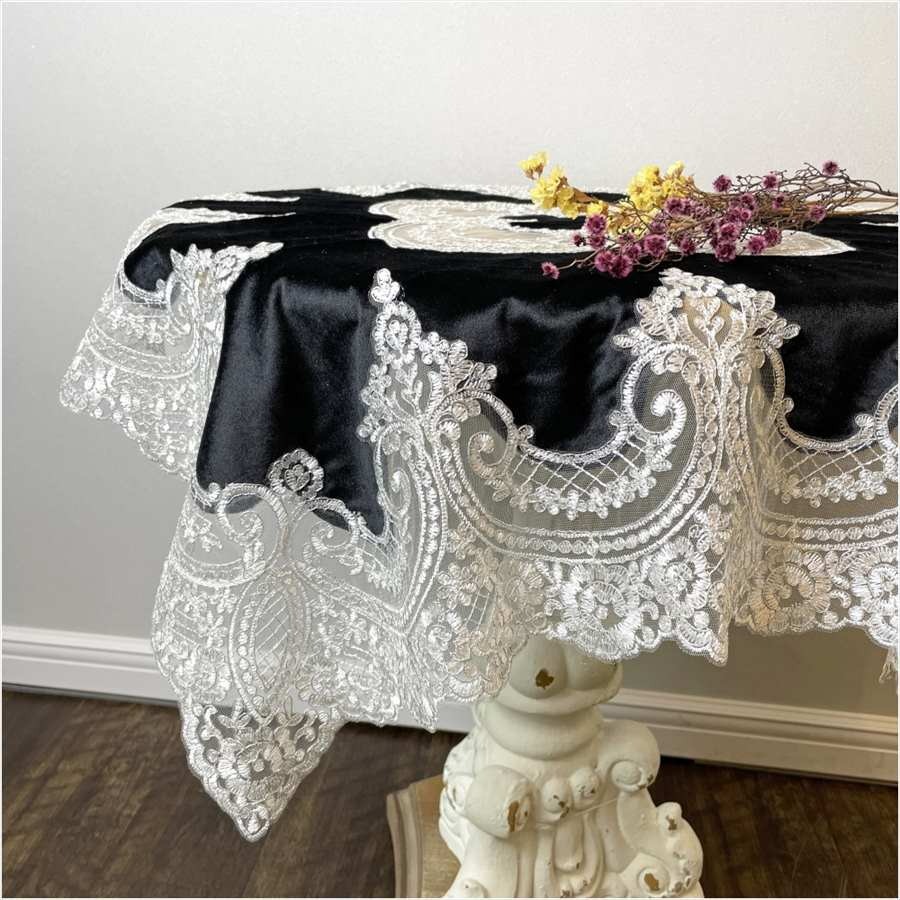 | 商品説明 | 美しい純白との銀糸による細やかな刺しゅうと、黒のベロア生地のコンビネーションが上品なテーブルクロス。