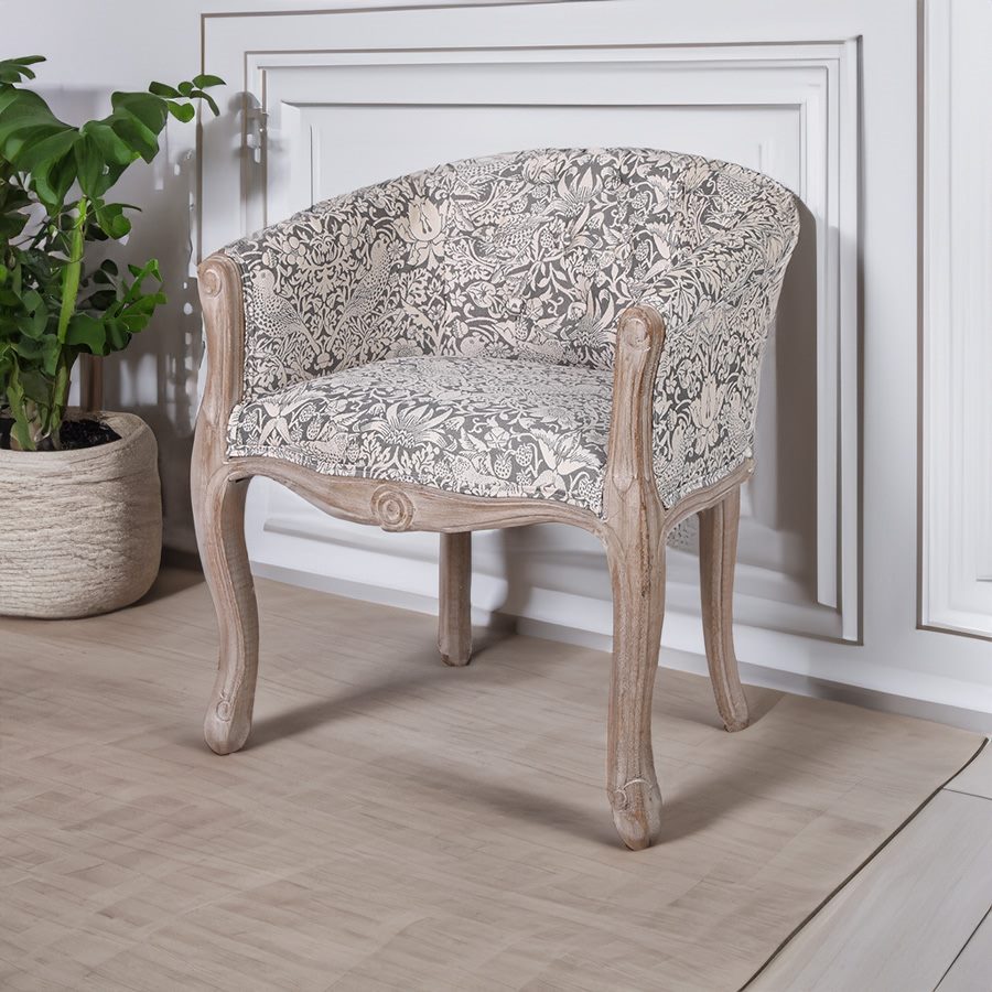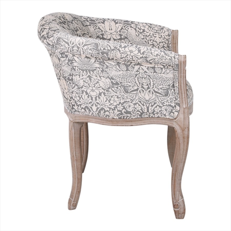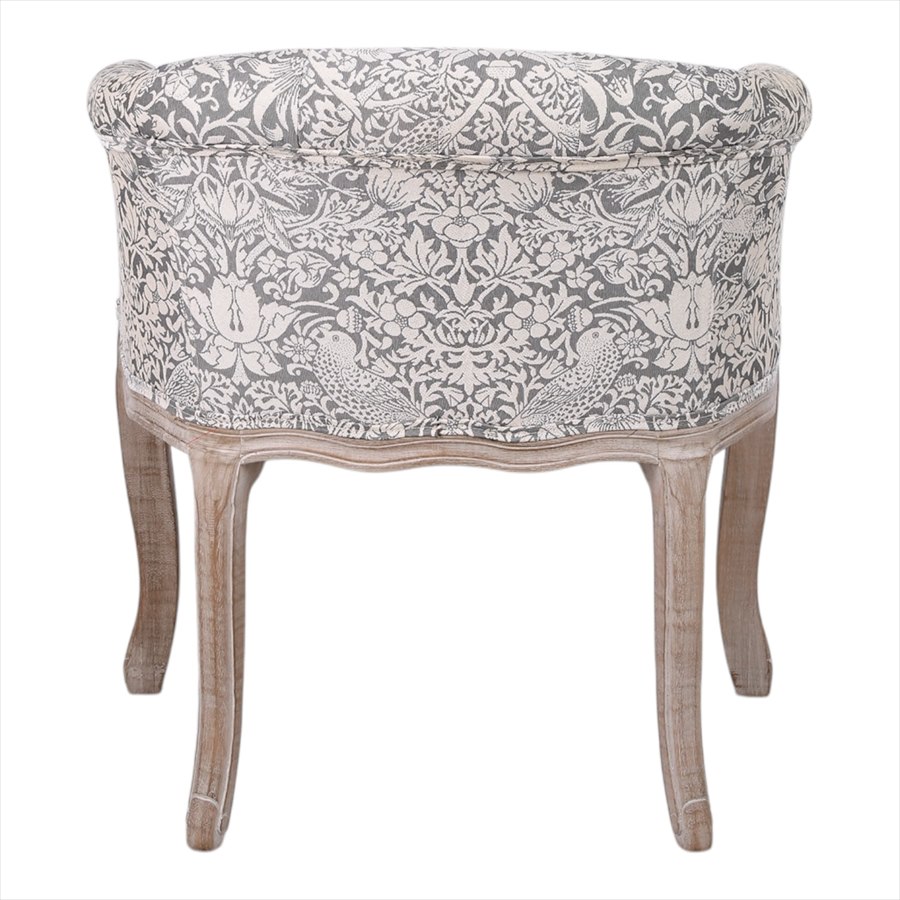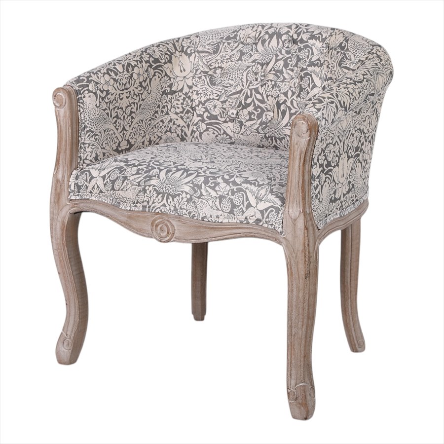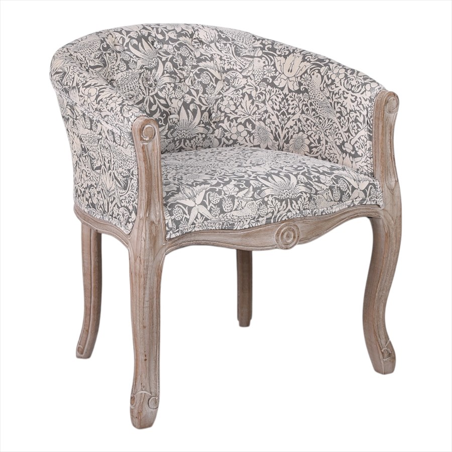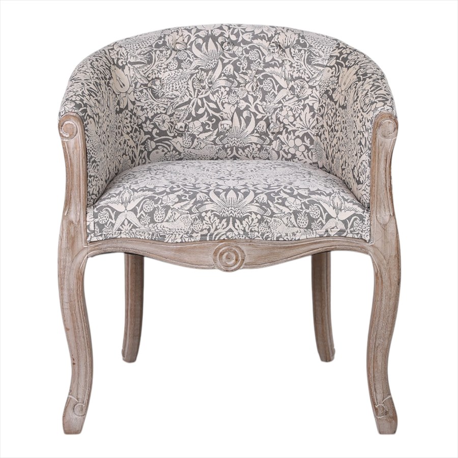 | 商品説明 | 高級なグレーのいちご泥棒のジャガード織生地を使用したシャビーシック仕上げのおしゃれなアームチェアです。 ボタン締めで高級感があります。小ぶりなので玄関や寝室にもおすすめ。 座面の硬さは普通~硬めの間です。 ※組立不要、完成品です。 *北海道沖縄離島は、送料別途見積もりとなります。 |