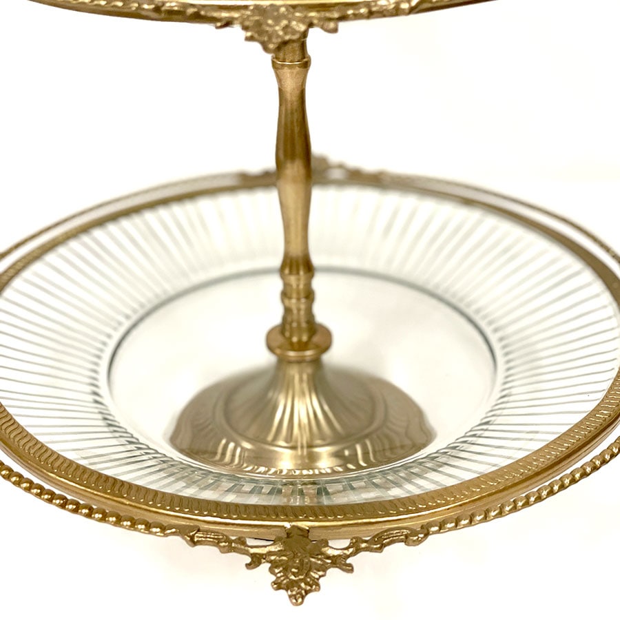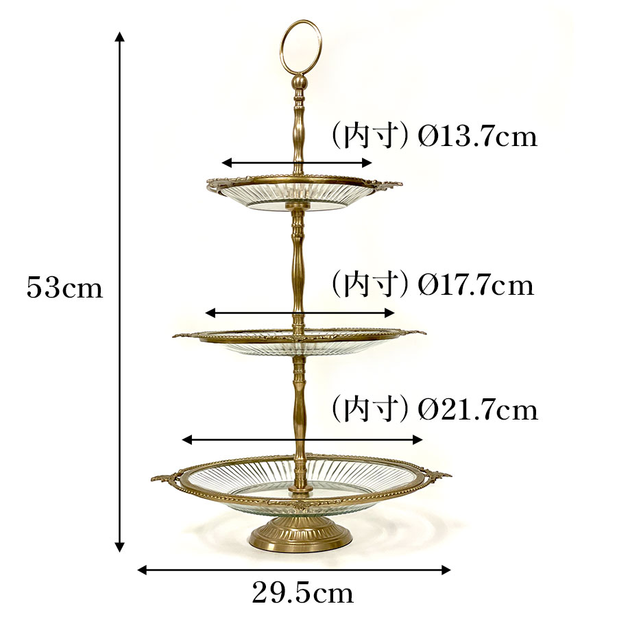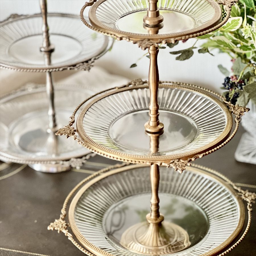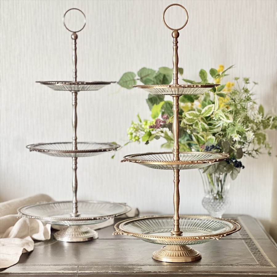 クラシカルな真鍮フレームとガラスプレートを組み合わせた、豪華な3段ディスプレイスタンド。 アフタヌーンティーやパーティーでのスイーツ・フルーツの盛り付けはもちろん、アクセサリーや雑貨をディスプレイする什器としても映える逸品です。 ゴールドとシルバーの2色展開で、上質なインテリア空間を演出します。 ・アフタヌーンティー用のケーキスタンドとして。 ・アクセサリーや雑貨を並べる店舗什器として。 ・ウェディングやイベントのテーブル装飾に。 ・季節のデコレーションやインテリアディスプレイに。 <インドの職人によるハンドメイド製品について> ・サイズや形状、装飾の風合いに個体差がございます。 ・アンティーク調の仕上げを施しているため、小さな傷・色ムラ・黒ずみ・仕上げの粗さなどが見られる場合がありますが、製品の特性としてご了承願います。 ・真鍮素材は経年変化により酸化し、色味が深まります。専用クロスや乾いた布で軽く拭くと輝きが戻ります。 ・ガラスには製造過程で微細な気泡や筋が入る場合があります。 |