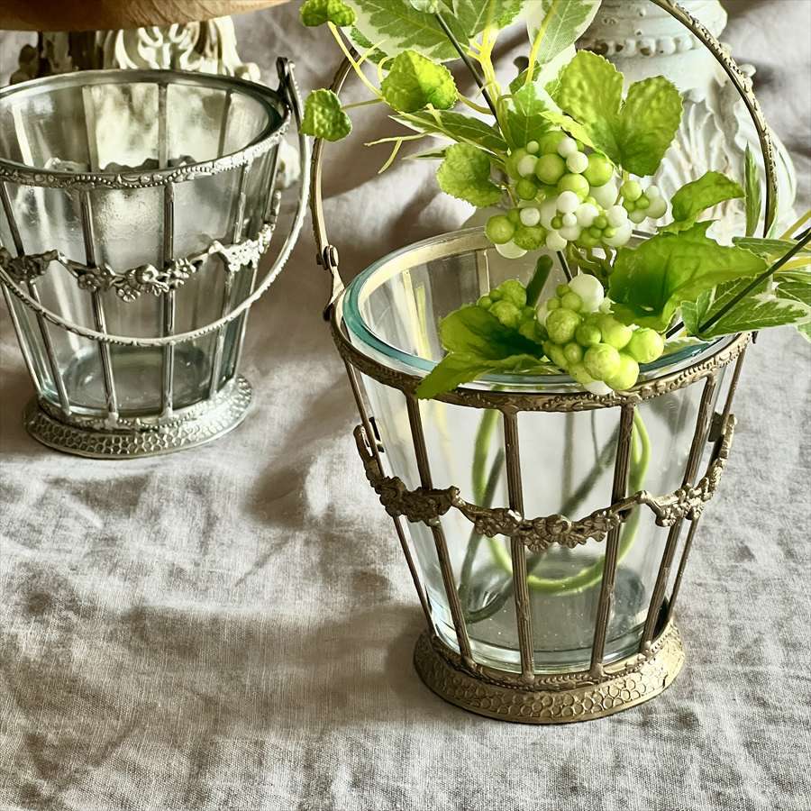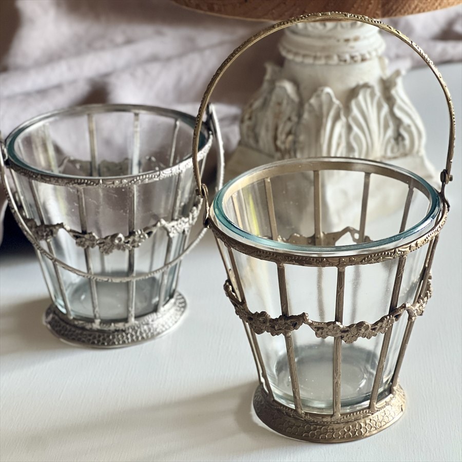 | 商品説明 | 花やリボンをモチーフにしたガーランド装飾があしらわれた、クラシカルな小さめバスケット。 真鍮の繊細なフレームと厚みのあるガラスの組み合わせが、上品な存在感を放ちます。 持ち手付きでディスプレイの幅も広がり、置くだけでヨーロピアンアンティークの趣に。 ・ミニブーケやドライフラワーを入れて そのまま卓上や棚の上に飾れば、簡単にクラシックなインテリアが完成します。 ・キャンドルホルダーやランタン風に 中に小さなLEDキャンドルを入れれば、温かみあるライティングオブジェに。 ・カトラリースタンドや小物収納に カフェ風のテーブルコーディネートに。ナプキンやカトラリーを立てても◎ ・イベントやウェディングの装飾に テーブルのセンターアイテムとしても使いやすく、華やかさを添えてくれます。 <インドの職人によるハンドメイド製品について> ・サイズや形状、装飾の風合いに個体差がございます。 ・アンティーク調の仕上げを施しているため、小さな傷・色ムラ・黒ずみ・仕上げの粗さなどが見られる場合がありますが、製品の特性としてご了承願います。 ・真鍮素材は経年変化により酸化し、色味が深まります。専用クロスや乾いた布で軽く拭くと輝きが戻ります。 ・ガラスには製造過程で微細な気泡や筋が入る場合があります。 |