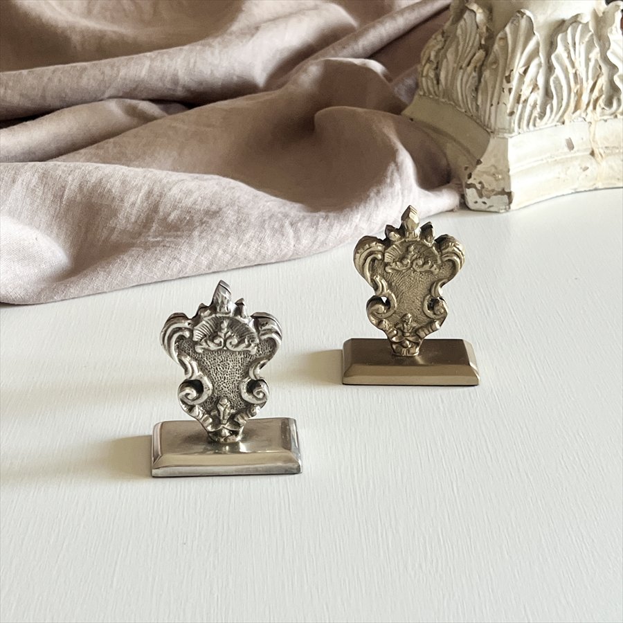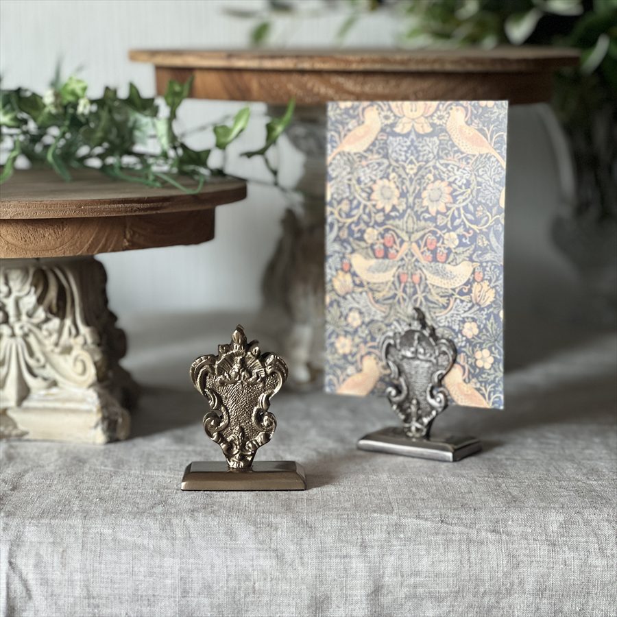 | 商品説明 | クラシカルなデザインが印象的な、真鍮製のカードホルダー。 重厚感のある真鍮素材に繊細な装飾を施し、ヨーロッパアンティークを思わせる上品な仕上がりです。 名刺やショップカード、メニュー、写真立て代わりとしてもお使いいただけ、デスクや店舗のディスプレイを華やかに演出します。 ・名刺立てとしてデスク周りに ・カフェやショップでメニューカードホルダーとして ・フォトスタンドとして小さな写真やポストカードを飾る ・ウェディングの席札スタンドとしてもおしゃれ <インドの職人によるハンドメイド製品について> ・サイズや形状、装飾の風合いに個体差がございます。 ・アンティーク調の仕上げを施しているため、小さな傷・色ムラ・黒ずみ・仕上げの粗さなどが見られる場合がありますが、製品の特性としてご了承願います。 ・真鍮素材は経年変化により酸化し、色味が深まります。専用クロスや乾いた布で軽く拭くと輝きが戻ります。 ・ガラスには製造過程で微細な気泡や筋が入る場合があります。 |