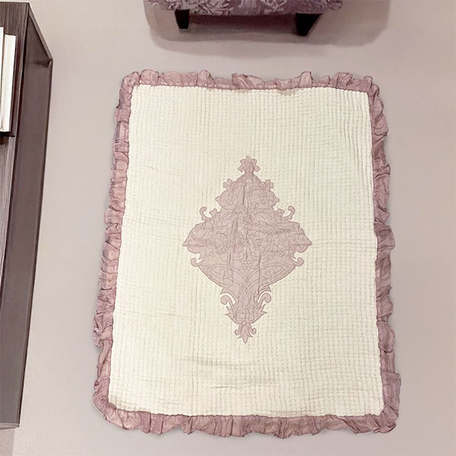 やさしい生成りカラーに、アンティーク調のモチーフをあしらった上品でナチュラルなフリル付きマット。 本体には肌触りの良いコットン素材を使用し、縁取りのフリルにはリネンを合わせることで、シンプルながらも表情のあるデザインに仕上げています。 110×85cmの程よいサイズ感で、ベッドサイドやソファ前、玄関・洗面スペースなど幅広く活躍。 裏面はゴム仕様のためズレにくく、見た目だけでなく実用性も兼ね備えたインテリアマットです。 【注意点】 ・天然素材を使用しているため、色味・織り・サイズに若干の個体差があります。 ・インド製品の特性上、プリントの濃淡や小さな織りムラが見られる場合があります。 ・洗濯の際は手洗い、またはネット使用の弱水流を推奨します。 ・漂白剤・乾燥機の使用はお避けください。 ・直射日光に長時間当てると色あせの原因となります。 |