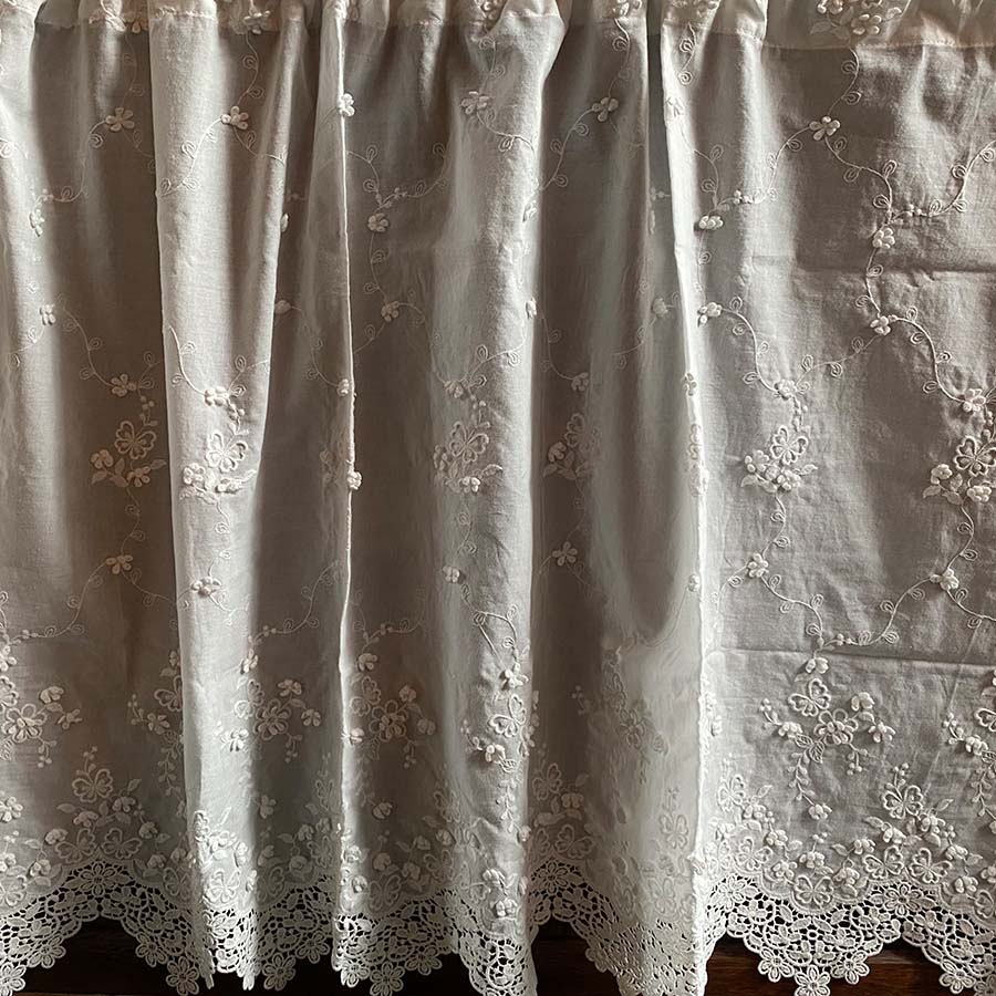| 商品説明 | 蝶やお花の刺繍が施されたホワイトの綿生地に小花が浮き上がるように刺繍された可愛いカフェカーテンです。 窓辺に、お部屋のアクセントに、光を集めて癒しの優雅なレースをお楽しみください。 なお、チュールレールは大変繊細なものです。 直射日光で長期間放置されますとまれに性質上溶けてしますことがあります。 埃をこまめに取り除きネットに入れてのお洗濯、できるだけ優しく手洗いしていただくと長持ち致します。 |