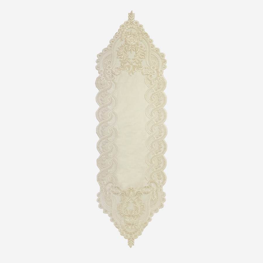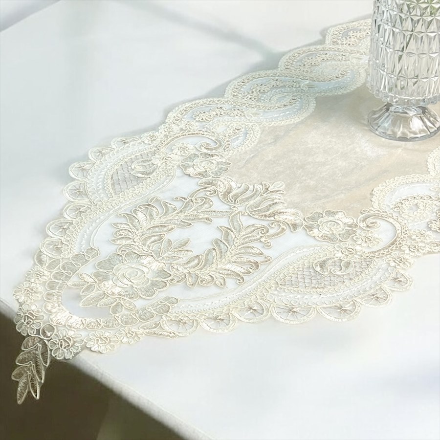 商品説明 上品な光沢を放つベロア素材に、繊細で華やかなレースを贅沢にあしらったテーブルランナー。