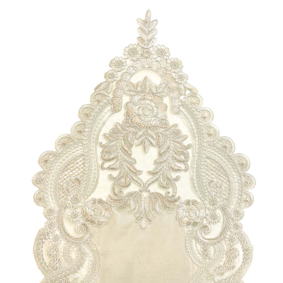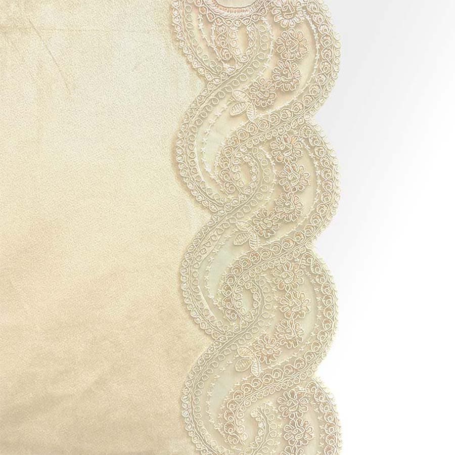 ベロアならではの柔らかな質感と、透け感のあるレースのコントラストが美しく、置くだけでテーブルコーディネートの主役になる存在感。